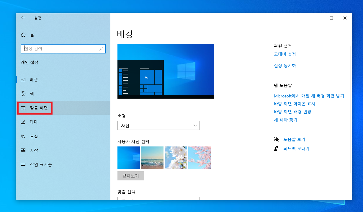 개인설정 메뉴의 잠금 화면으로 들어갑니다.