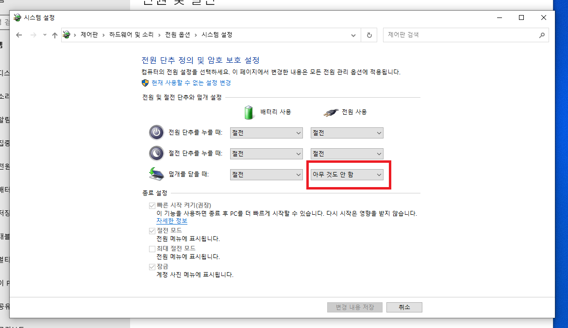 여기에서 전원 사용의 덮개를 닫을 때 행동을 아무것도 안 함으로 설정해주시면 됩니다. 기본적으로 클램쉘 모드는 전원을 연결하고 사용하기 때문에 전원 사용 부분만 설정해주셔도 되지만 사용 환경에 따라 배터리 사용 부분도 설정해주시면 될 것 같습니다.