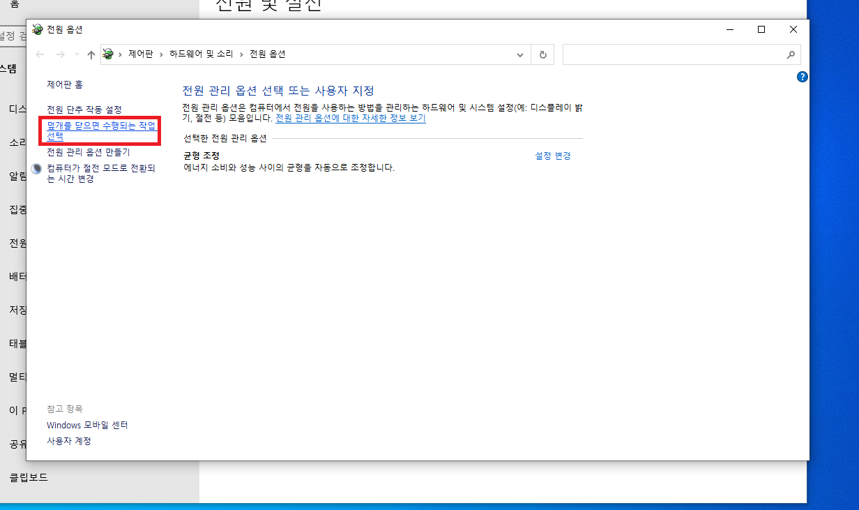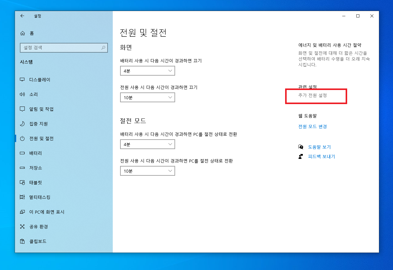 화면 우측에 있는 추가 전원 설정으로 들어갑니다. 설정된 창 크기에 따라 우측에 있을 수도 하단에 있을수도 있습니다.