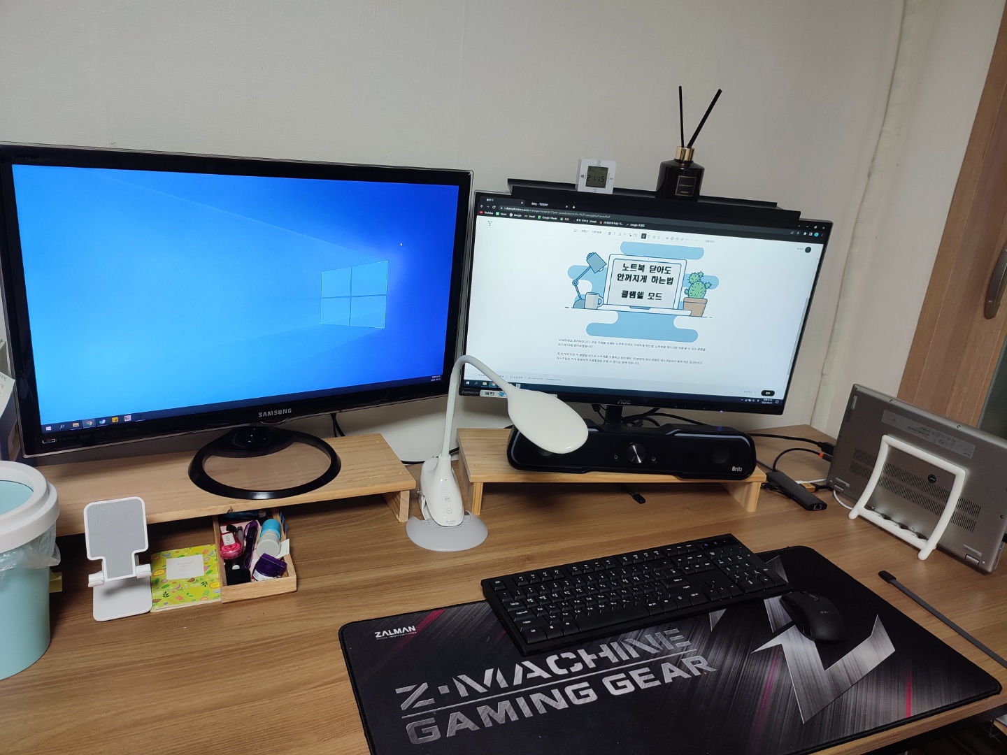 이 노트북을 모니터 2대와 무선 키보드, 마우스와 연결해서 마치 데스크톱처럼 사용하고 있습니다.